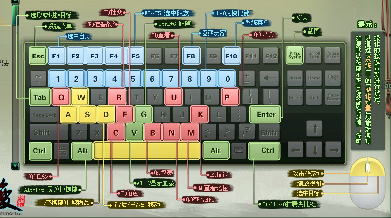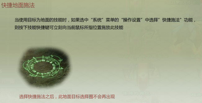 当使用目标为地面的技能时,如果选中“系统”菜单的“操作设置”中选择”快捷施法”功能,则按下技能快捷键可立刻向当前鼠标所指位置施放此技能。