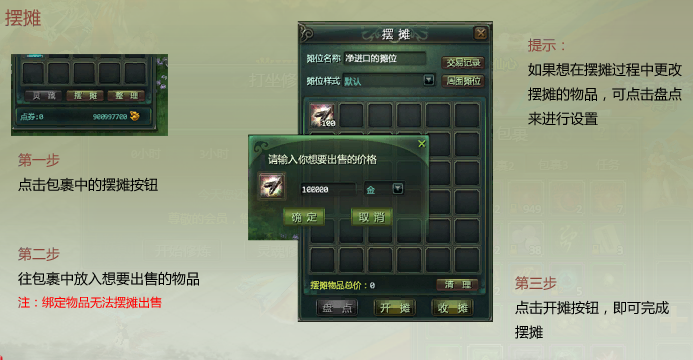 摆摊:点击背包中“摆摊”功能按钮可激活摆摊功能。
