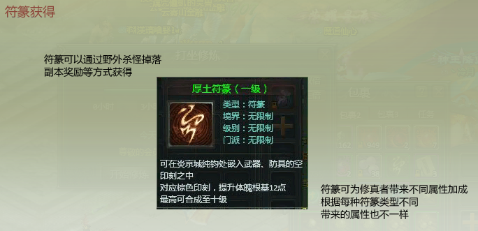 同名同等级的3-5个符篆可在炎京城的符篆镶嵌师处进行“符篆合成”,可以合成更高一级的符篆,获得更多的属性加成。