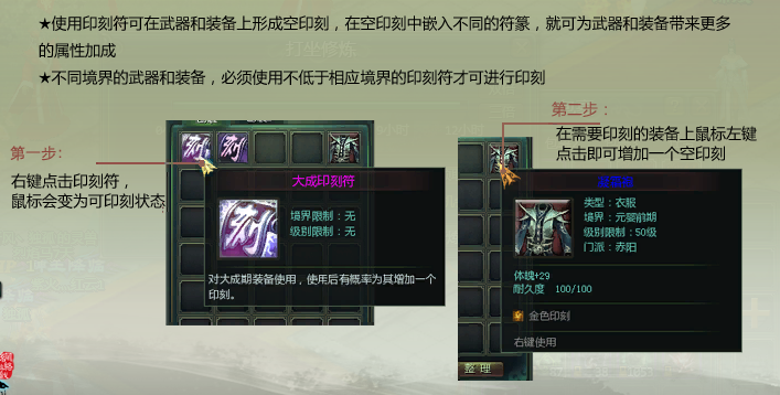不同境界的武器和装备,必须使用不低于相应境界的印刻符才可进行印刻。